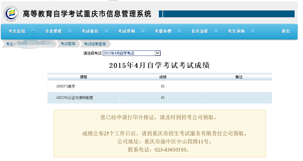考試結束20個工作日后,全體考生登錄高等教育自學考試重慶市信息管理系統http://zk.cqksy.cn查詢自學考試成績。登錄重慶市高等教育自學考試信息管理系統,點擊高等教育自學考試信息管理系統,點擊“查詢考試結果”進入下圖所示頁面,選擇考試查詢。申請證書后,請到重慶招生考試服務有限公司領取。